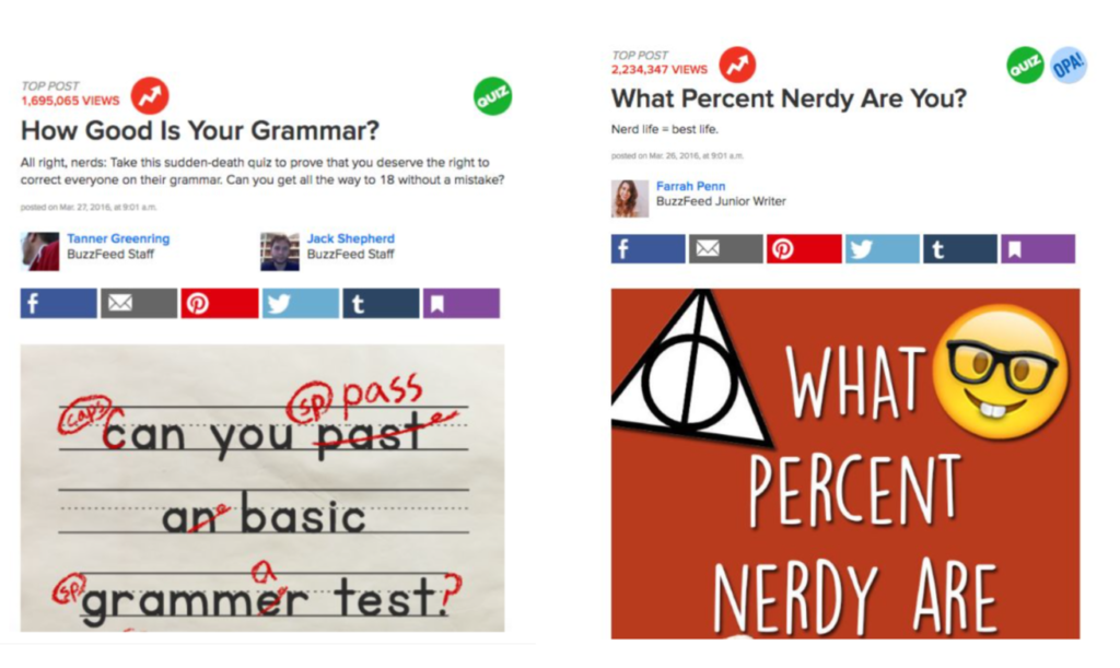 • This continuous refinement extended to the presentation of quizzes on the user end, and led to small innovations that made it so the process of taking quizzes was smoother and faster. We also improved user experience in ways that directly led to overall increases in quizzes being taken, such as the “infinite quiz” model which served up a new quiz for the reader after they’d completed one to encourage binge-quizzing.