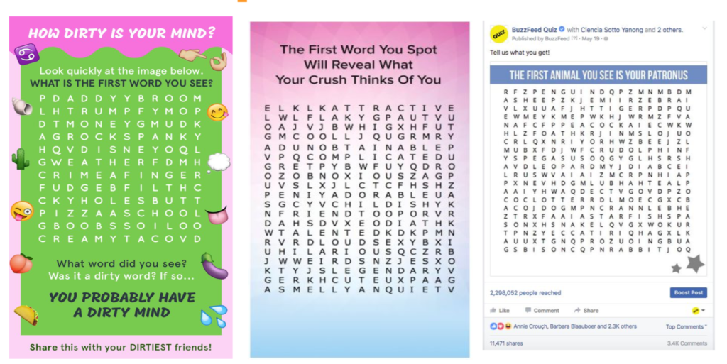 I am looking for work that allows me to continue on with the fairly complex skill set I developed at BuzzFeed. I was stationed in editorial as Director of Quizzes and Games but worked with teams in product, engineering, data, marketing, creative/advertising, video, and social media – quizzes touched almost every part of the company, so I often worked as an internal consultant. You can find a sampling of the content I made for BuzzFeed here. This is a breakdown of my work at BuzzFeed that was not forward-facing.
