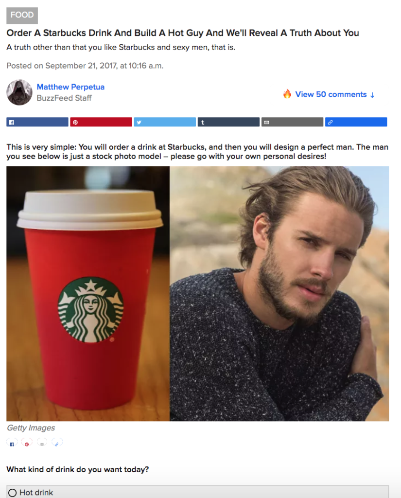For example, in this quiz I used an experimental secondary quiz builder that included weighted scores and rigging so that the entire first section of the quiz was essentially an un-scored placebo, and determined results by how users answered one or two particular questions. The audience had no idea, but this method allowed for a level of “accuracy” that excited most of them. It was a hit, as were all subsequent iterations on the theme.